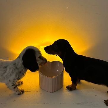 Puppies always have access to water. Depending on the breed, age, and the breeder's instructions, the puppies are fed on their usual schedule